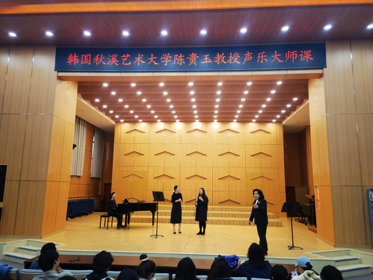 来访期间,代表团还参观了我校油陶作品陈列馆,深入了解我校特色艺术成果。下午,代表团一行到访音乐与舞蹈学院,为师生开展专题宣讲。宣讲结束后,秋溪艺术大学国际交流院长陈贵玉教授、公演艺术系金美榮教授为师生带来了一场生动的声乐大师课,并围绕艺术表演技巧、教学实践经验方法等内容展开互动交流,为两校后续教学合作与学术交流提供了宝贵的实践参考。