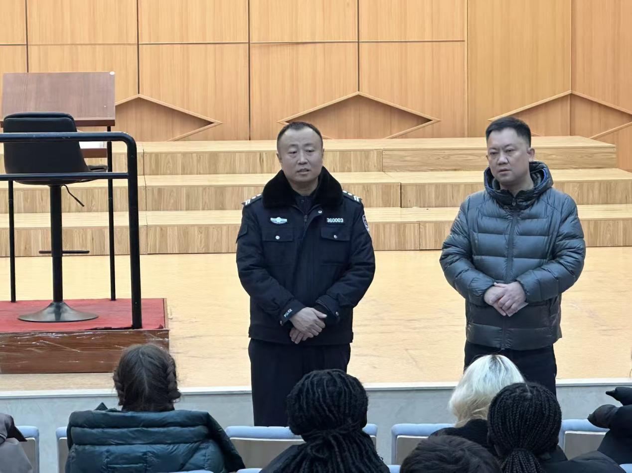 随后,保卫处校园秩序科科长吴俊涛围绕国家法律法规及学校规章制度展开讲解,并着重强调来华留学生应严格遵守中国的法律法规和学校的各项规章制度,树立法治意识和规则意识。此外,他还针对人身安全和财产安全防范进行重点提醒,并提供了具体建议,帮助来华留学生提高自我保护意识。