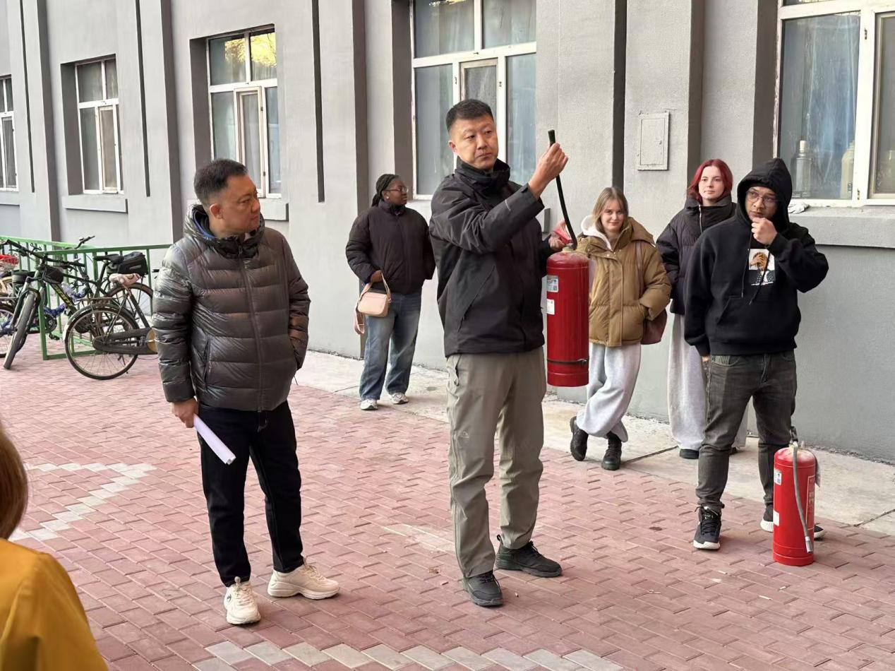 法律法规讲解之后,保卫处消防安全科科长范维带领来华留学生前往指定场地,开展安全实操演示。演示过程中,首先介绍了灭火器和消火栓的构造及操作注意事项,随后示范了正确使用流程,并邀请来华留学生代表进行实操练习。随后范维科长带领来华留学生实地查看宿舍楼内的应急逃生通道,详细讲解了应急逃生通道的安全标识、开启方式以及逃生注意事项。让来华留学生在演练中熟悉逃生路线和技巧,进一步提升了应对突发安全事件的应急处置能力。